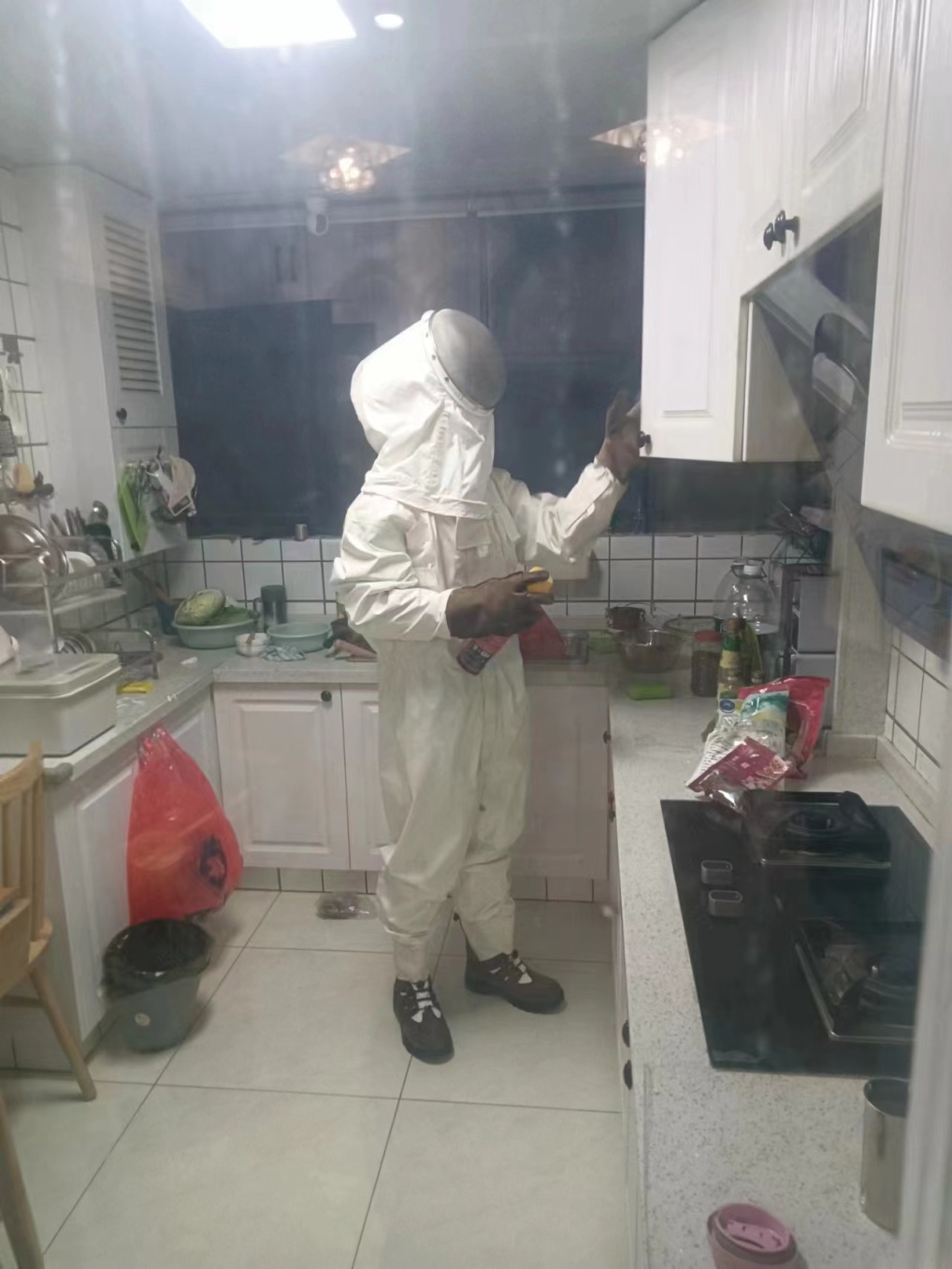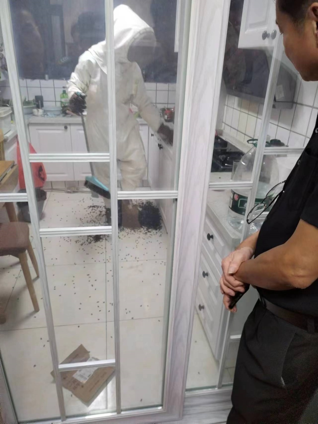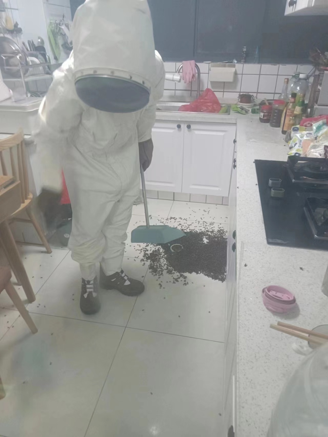 近日,山阳镇海尚馨苑小区一居民在自家厨房一角发现了惊人的一幕:家中的燃气表储藏室内挤满了成千上万只蜜蜂,就连墙壁上也聚集了大量的蜜蜂。全家人感到非常害怕,随即在楼道微信群内寻求帮助。
