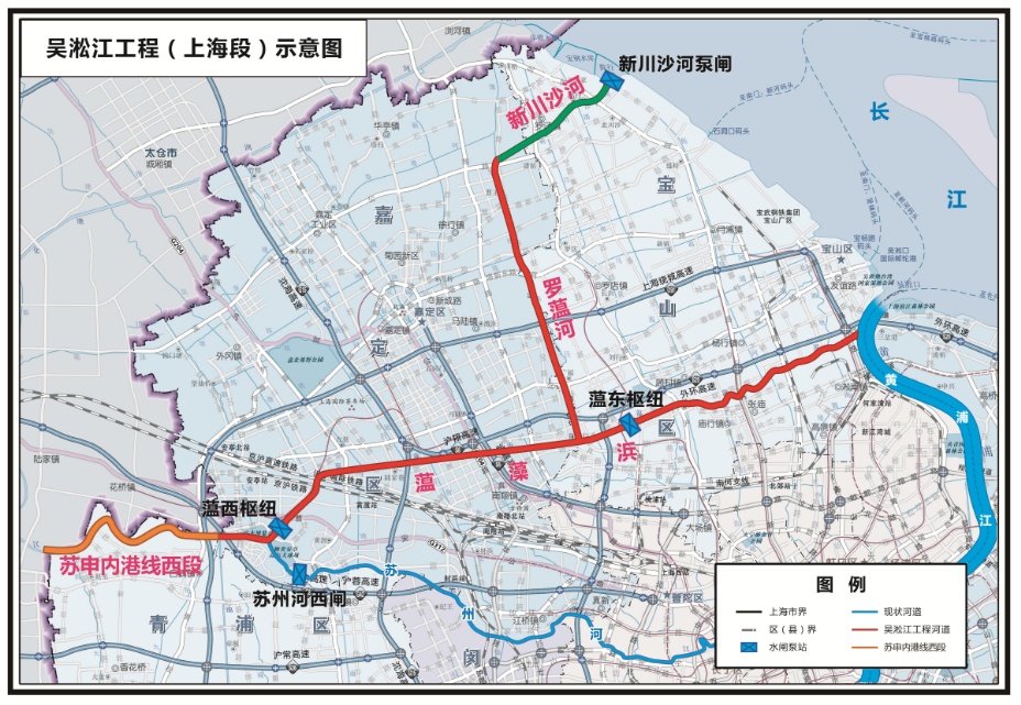 吴淞江工程(上海段)西起苏沪省界,经吴淞江、蕰藻浜、罗蕰河、新川沙河,东出黄浦江和长江。建成后将为上海嘉定、宝山增加一条骨干排江通道,有效缓解除涝压力,同时利用上游太湖来水,改善区域河网水动力条件。