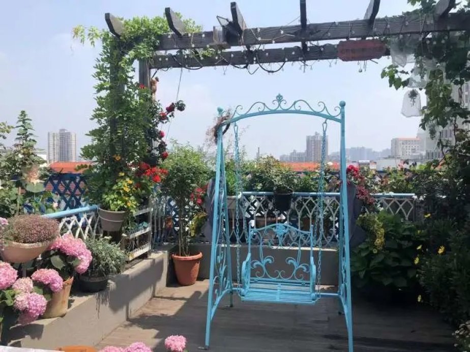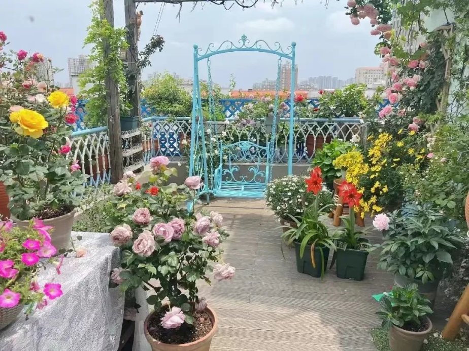 功夫不负有心人,整个露台越来越美,邻居、好友在花开时节常来做客,喝茶赏花,吕女士还编织了花环赠予他们。
