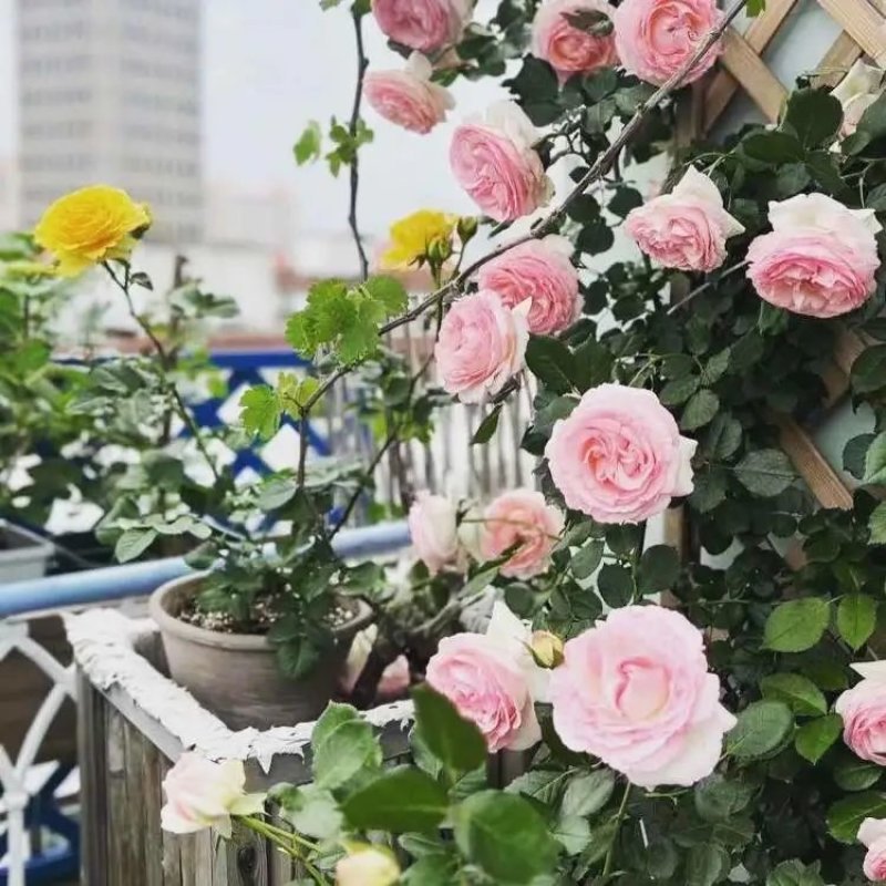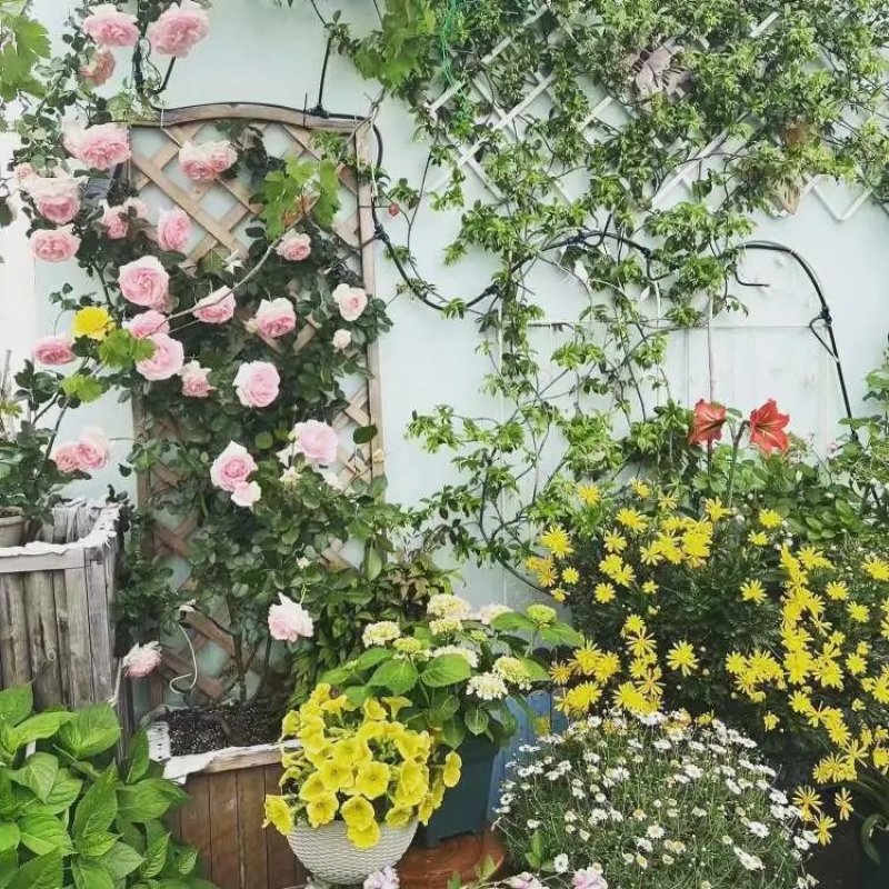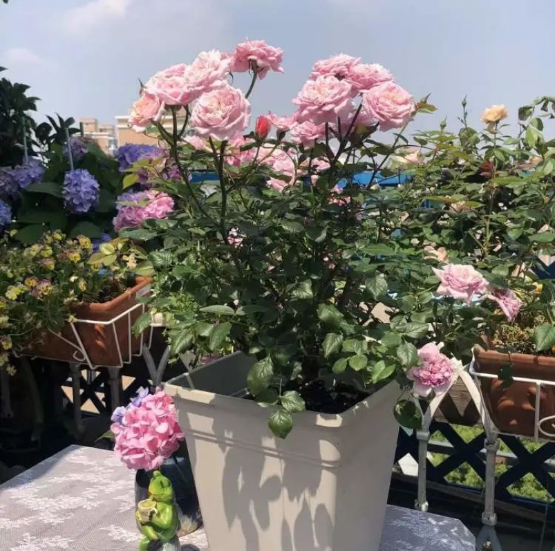 从专业上看,7楼的露台虽然光照、通风良好,对月季等喜光、喜干爽的花卉生长很有利,而对绣球类喜欢半阴半阳、喜湿润环境的花卉不利,因此对此类花卉夏季要注意摆放位置;还有棚架上的紫藤、葡萄等藤蔓性植物要考虑以后增长空间的平衡。