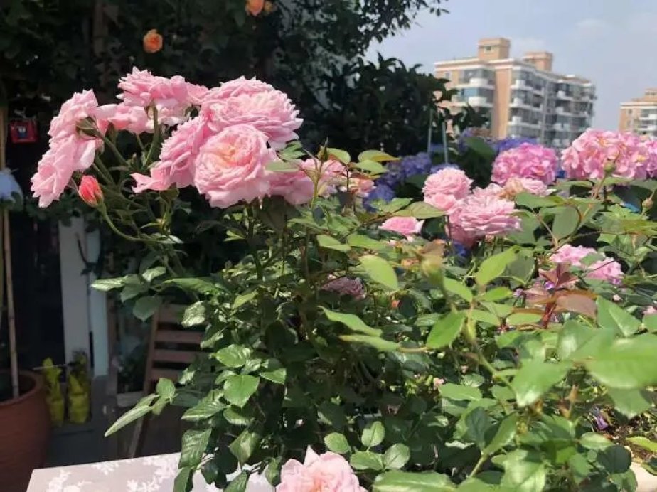 绣球之外,各个品种的月季也是露台的一大特色花卉。