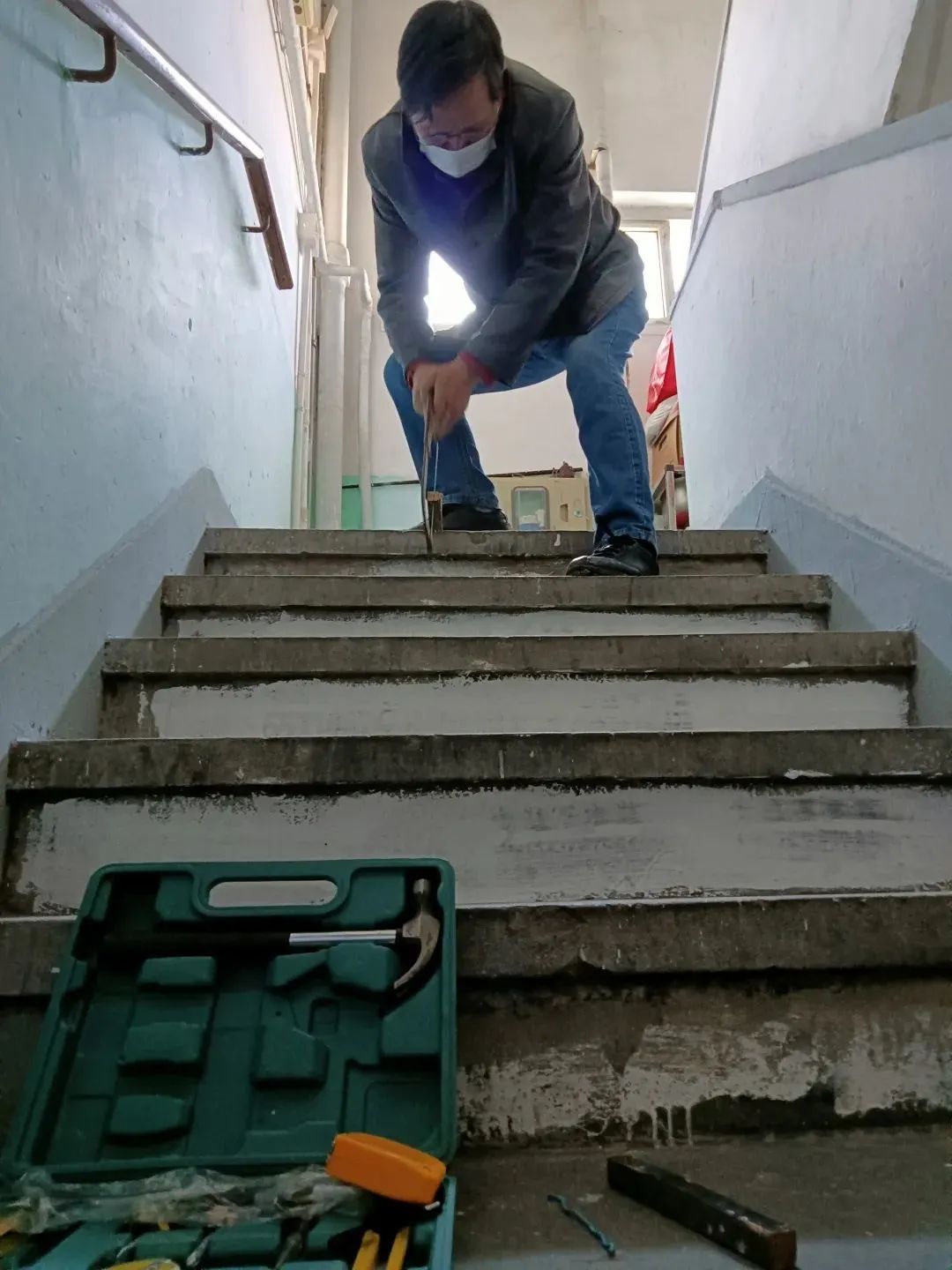 503室的郑师傅、204室的90后罗先生、104室的张阿姨,还有居委会主任陶升东,地上垫着报纸,身上穿着雨衣,大家齐心协力前前后后刷了1个月,看着如今洁白如新的墙面满满的成就感。楼道电灯也同步进行了更换,还在楼面贴上了反光安全贴纸,照亮了回家的“最后一米路”。