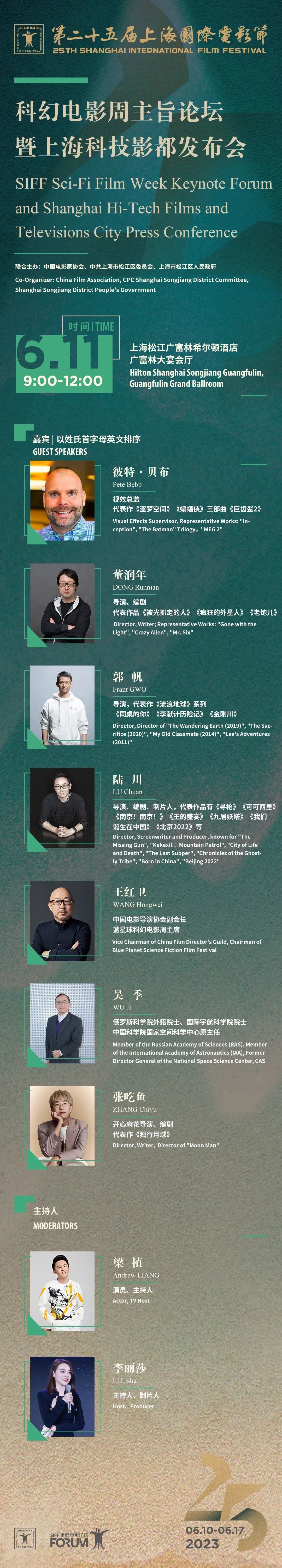本届科幻电影周系列活动由主题论坛、主题展映和户外放映等活动组成。主题论坛共3场,分别是“科幻电影周主旨论坛”“科影融合论坛”和“电影科技论坛”,郭帆、王红卫、陆川、董润年、张吃鱼等中国科幻电影的核心创作者,国际知名视效艺术家彼得·贝布,以及诸多优秀科幻电影的概念设计者等幕后主创及科学顾问,将齐聚一堂,围绕“科幻电影的国际视野与时代语境”“科幻电影:想象力与科学精神”以及“科幻电影驱动电影工业升级”等话题展开探讨。