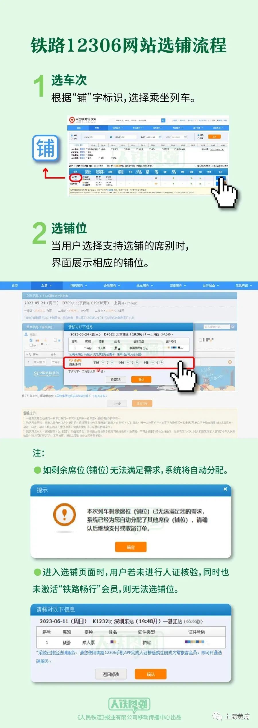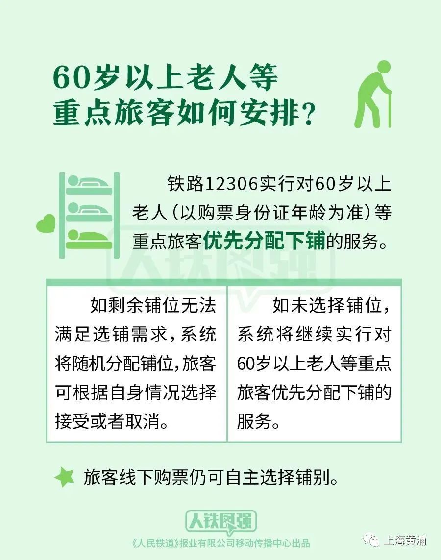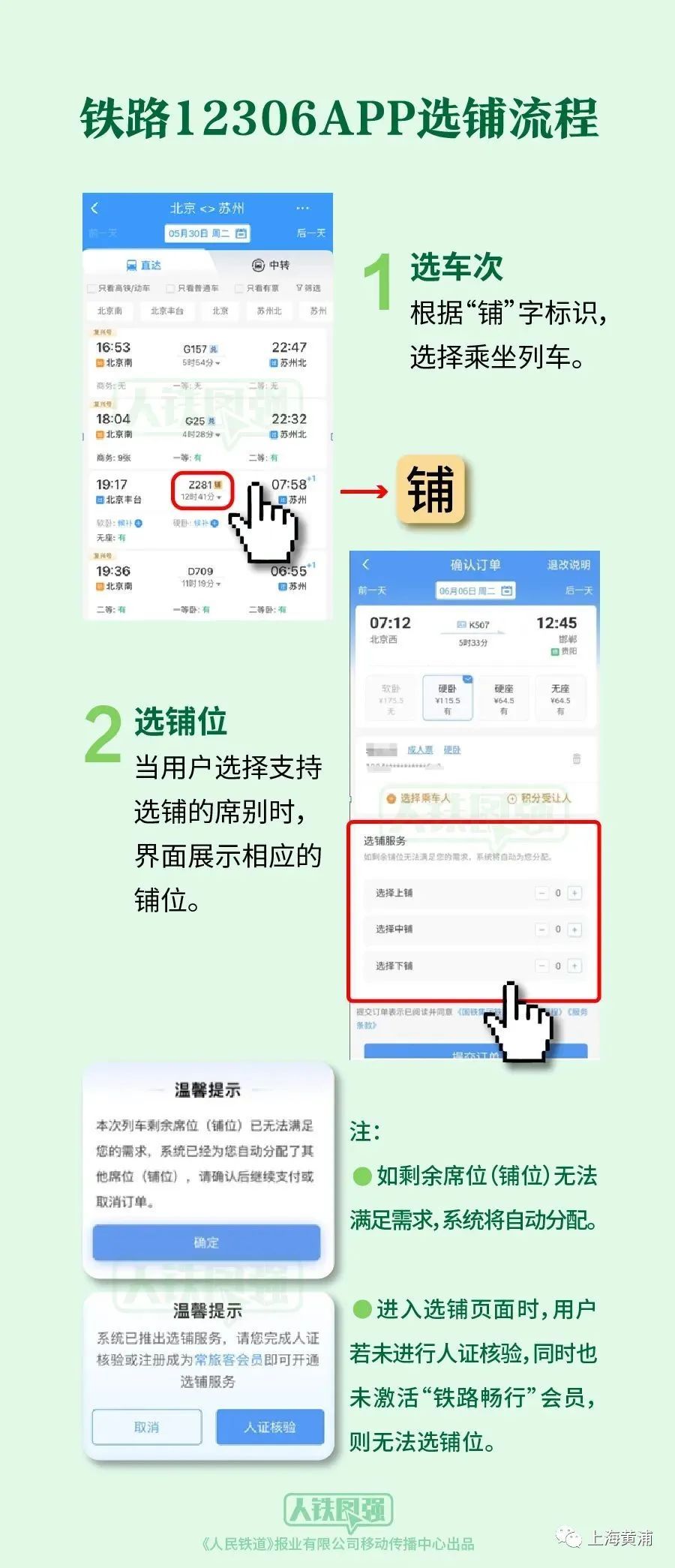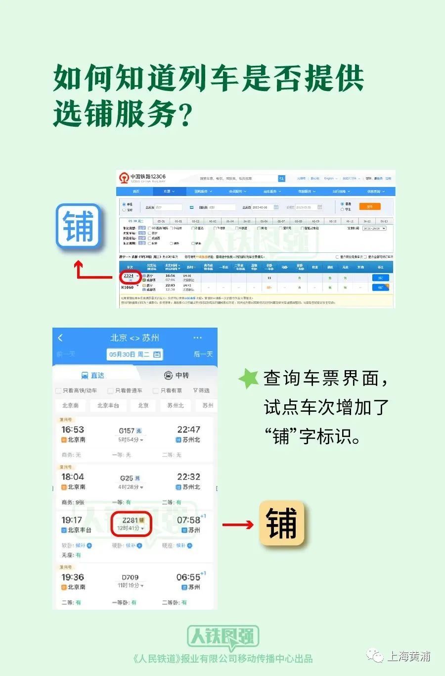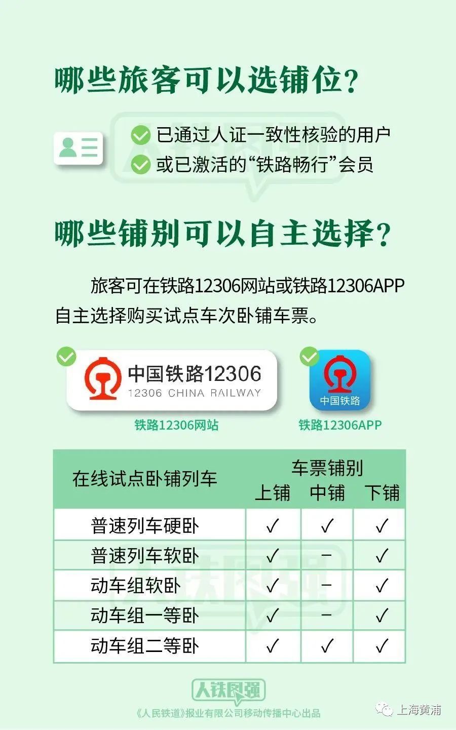 6月10日起,国铁集团在12306网站(含手机客户端,下同)试行在线选铺服务,选择通达全国各区域的230趟高铁、普速旅客列车作为试点,对普速列车软卧、硬卧和动车组软卧、一等卧、二等卧等铺别提供在线自主选铺服务,同时,继续实行对60岁以上老人等重点旅客优先分配下铺的服务。