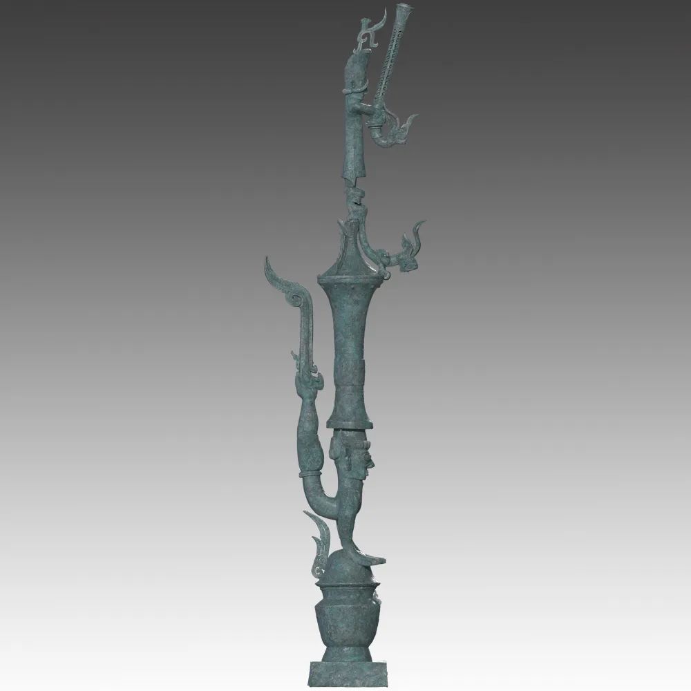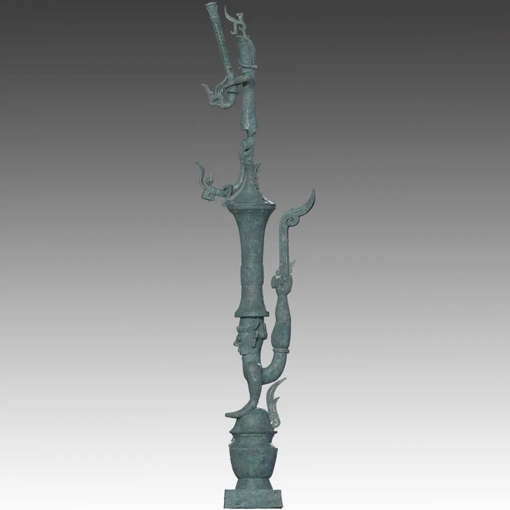 铜罍座倒立鸟足顶尊神像通高2.53米,四部分构成。由出自1986年发掘二号坑出土的铜鸟足人像、2021年三号坑出土的爬龙铜器盖、2022年八号坑出土的铜顶尊撑罍曲身人像、铜持龙立人像、铜杖形器四个部分组合而成。