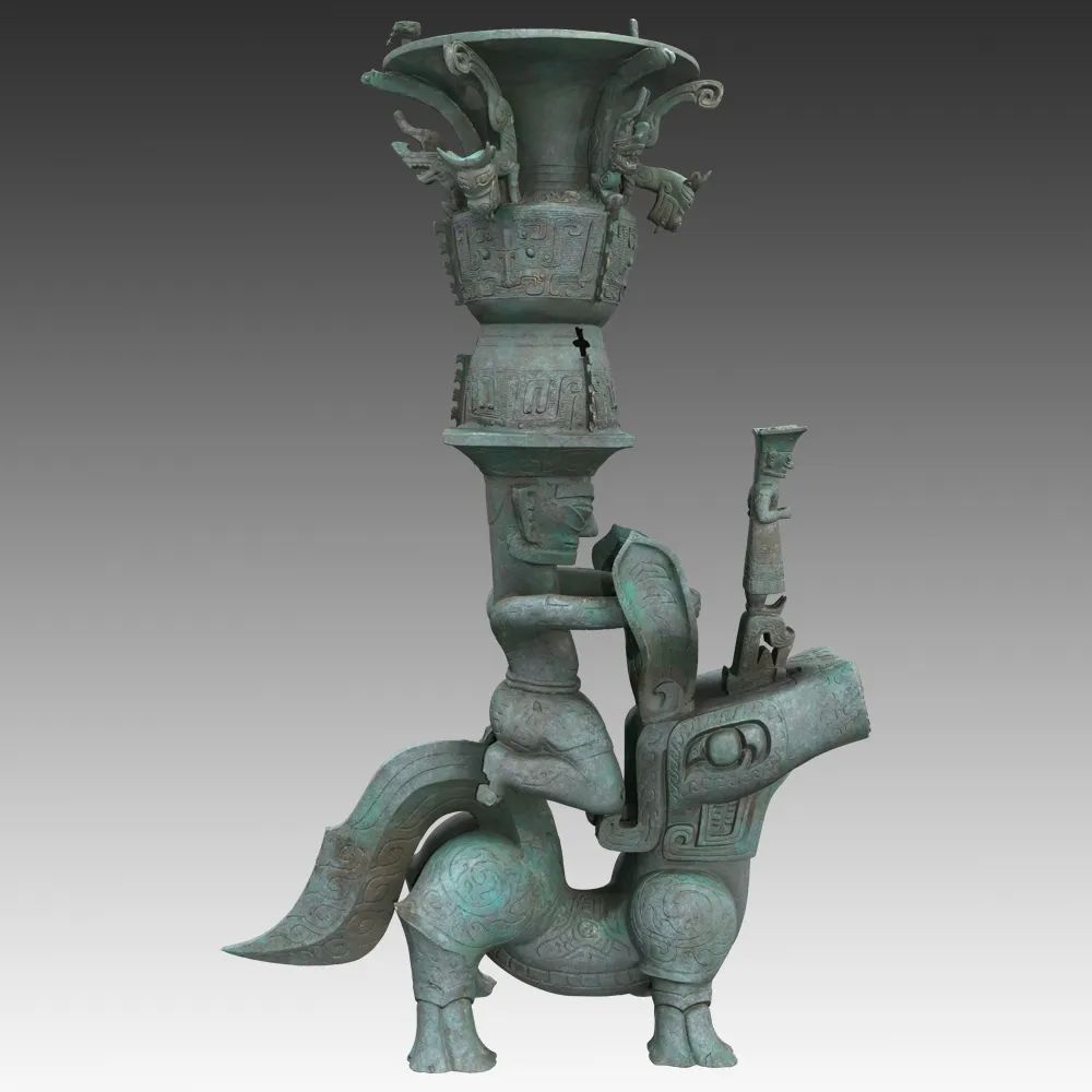 这组青铜器表现了一个祭台,塑造了一个祭祀场景。跪在神兽背上的应是巫者身份,跪立是古蜀礼神最虔诚的姿势。站立神兽头顶的铜人,或许是象征古蜀王者。巫者头顶的铜尊具有中原文化风格,尊内盛有装有祭品海贝,玉或者酒。