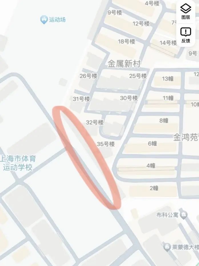 两个小区的西面是上海市体育运动学校。该校在东南围墙处栽种了40余棵水杉树,树高约30米,与金属新村和金鸿苑小区部分楼房仅一墙之隔,距离最近处不足5米。