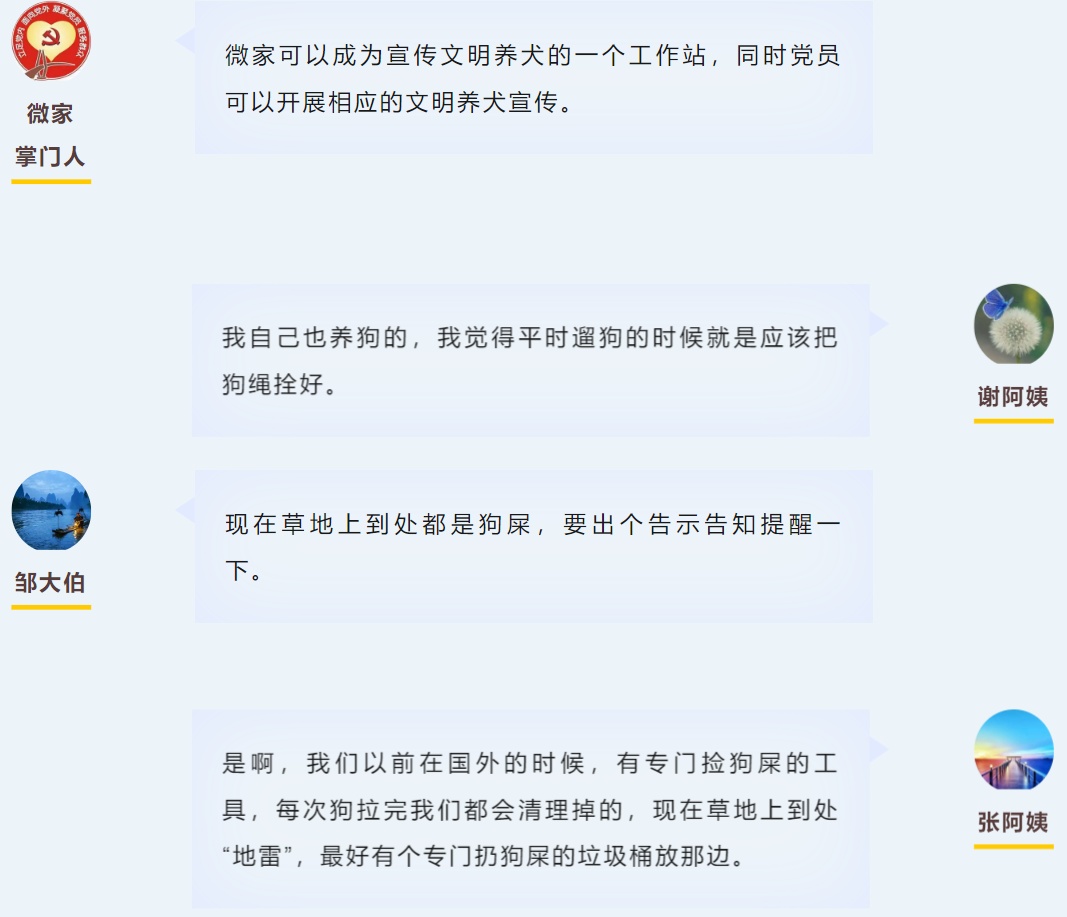 新南居委党员志愿者的意见统一收集并整合后,文明养宠系列活动随机开展,通过知识普及,发放牵引绳,提升文明意识。居委会和小区志愿者围绕“文明养犬”组织居民议事,与会人员围绕如何引导小区居民做到文明养犬展开了热烈讨论。