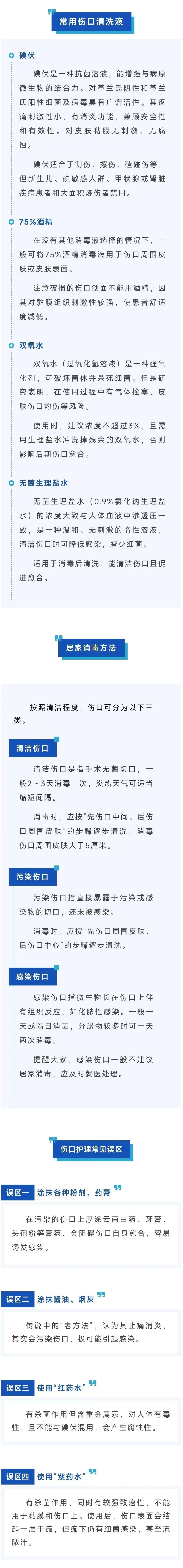 与过去家里只备“红药水”“紫药水”等传统守旧的消毒方式相比较,目前人们开始使用碘伏、酒精、生理盐水等更科学的居家伤口消毒处理方法。但如果居家消毒不严谨,很容易使伤口出现慢性感染症状,那么日常生活中的伤口该如何正确护理呢?来自上海市第八人民医院门诊护理组的专家,为大家讲讲居家伤口护理的方法。