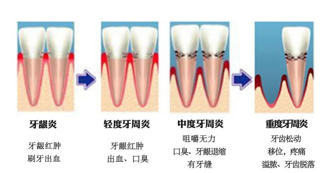 简单来说糖友如果牙龈炎不早期治疗就容易发展成牙周炎,牙周炎是不可逆的。研究表明[1],糖尿病患者患重度牙周炎的风险比普通人高8.5倍,缺牙的风险高2倍。