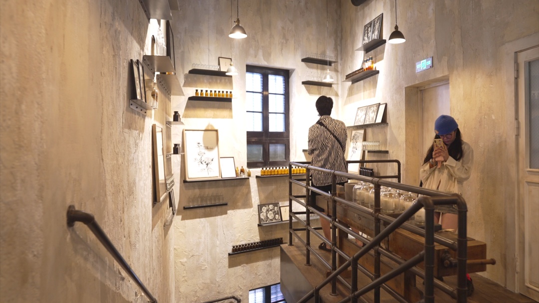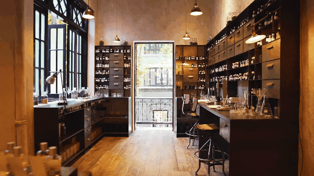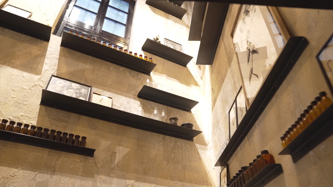 斑驳墙面上,摆放着制作香水的天然植物等原材料,其中还有几个古董标本,精致又特别。