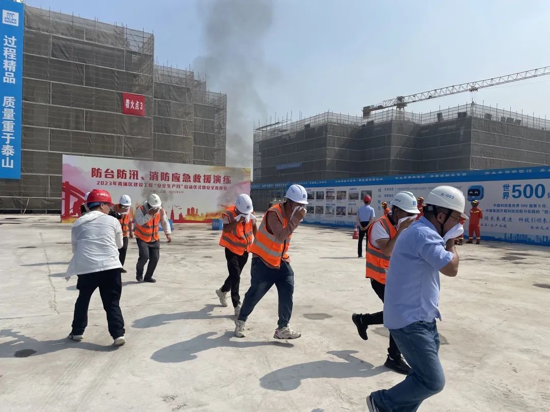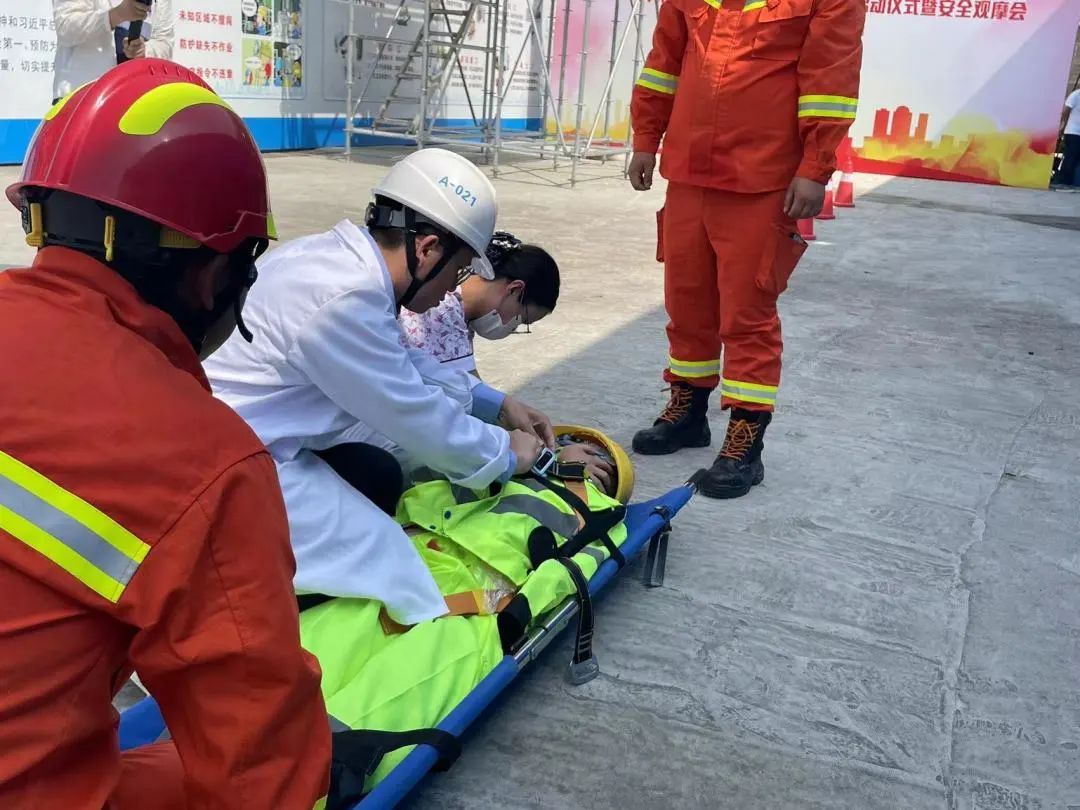 活动现场,上海医都医院项目建设单位——中建科技集团有限公司就施工现场的火患消防、防台防汛、高处坠落等突发事故处置开展了应急演练。当应急事件发生时,项目部第一时间启动应急预案,有序疏散作业工人并开展现场自救,并与随后抵达的消防、医疗等专业救援人员高效对接。各项演练均响应迅速、汇报清晰、处置步骤紧张有序、应急物资正确使用,体现了该项目施工单位较高的应急处置能力,以及现场作业人员较高的安全意识和素养,给观摩各方留下了深刻的印象。