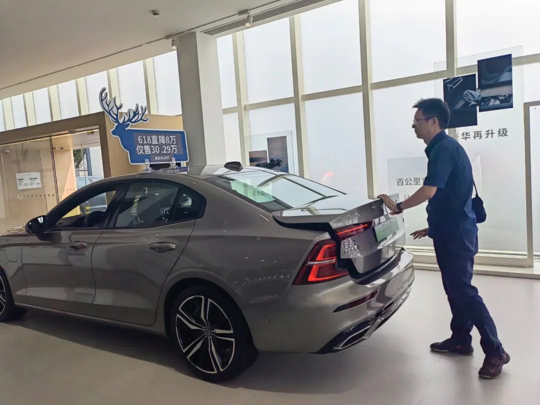 在澄浏中路的上海永达嘉沃汽车销售服务有限公司,门店新上市的沃尔沃XC60峡湾版被摆在显眼位置。新车沿用原有车辆的宽大空间,在车顶还装载了原厂行李箱。在价格方面,结合品牌方在“618”大促期间提供的2万元补贴,再叠加嘉定补贴,该车落地价在30万元左右。