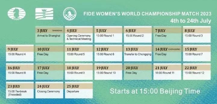 按照赛程安排,比赛前半程六盘棋在上海举行,后半程六盘棋以及快棋加赛(如果有)在重庆举行。比赛为“两盘一休”的节奏,第一盘棋7月5日在上海棋院开战。