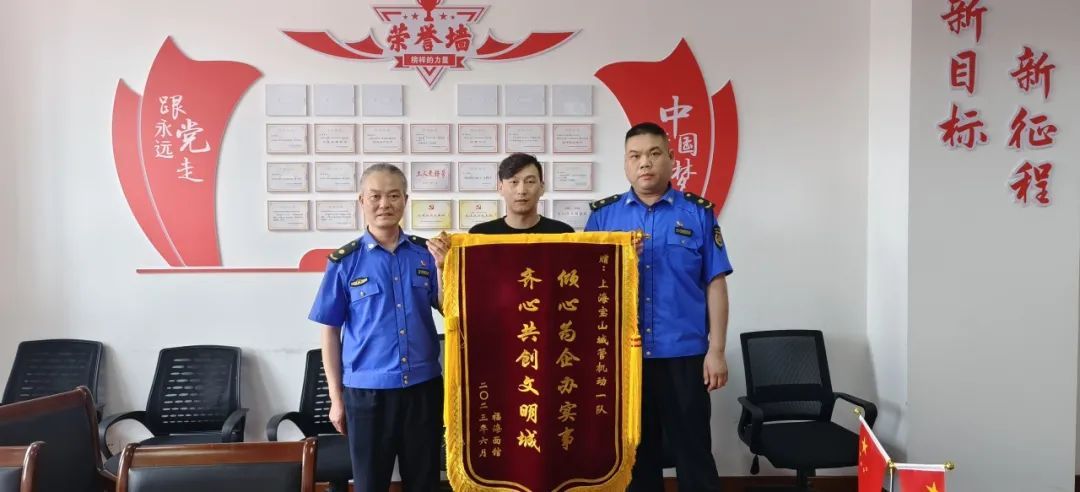 近日,宝山某“网红面馆”老板将一面印着“倾心为企办实事 齐心共创文明城”的锦旗送到宝山城管机动一队,向执法队员心系商户、温情执法的工作态度表示感谢。