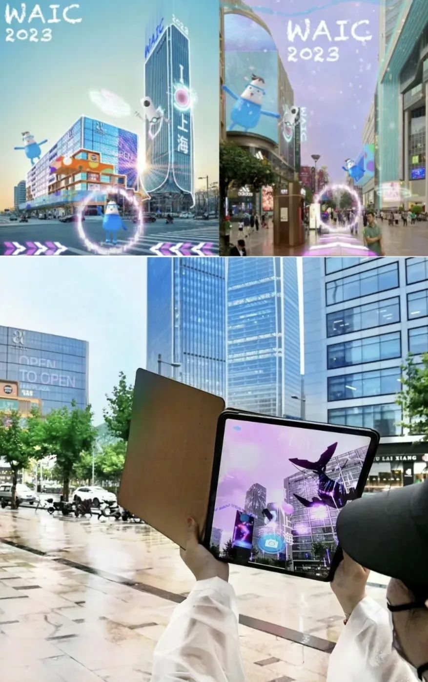 通过微信小程序和iPad,体验者可以实现对这些地标区域的识别。当你站在这些地标建筑前时,它们将化身为一个奇妙的窗口,展示今年世界人工智能大会的精彩内容。此外,当体验者面对地标建筑时,大会IP形象“威克兄弟”将在建筑前跳舞、打招呼、拍摄视频,体验者可与“威克兄弟”互动分享并合影留念。与往年不同的是,今年的打卡点引入了穿梭门的设计,通过穿梭门,体验者能看到虚实结合的世界,真正体验到AR元宇宙的魔力。