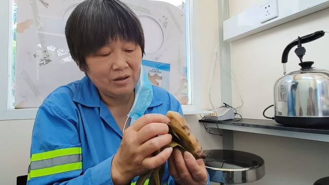 上午11点,烈日炎炎。来到学府路与南安路的路口处,记者看到“有光有爱小驿站”正矗立在街头,环卫工人戚娟宝在里边一边吹着空调,一边加热自带的中饭,很是惬意。