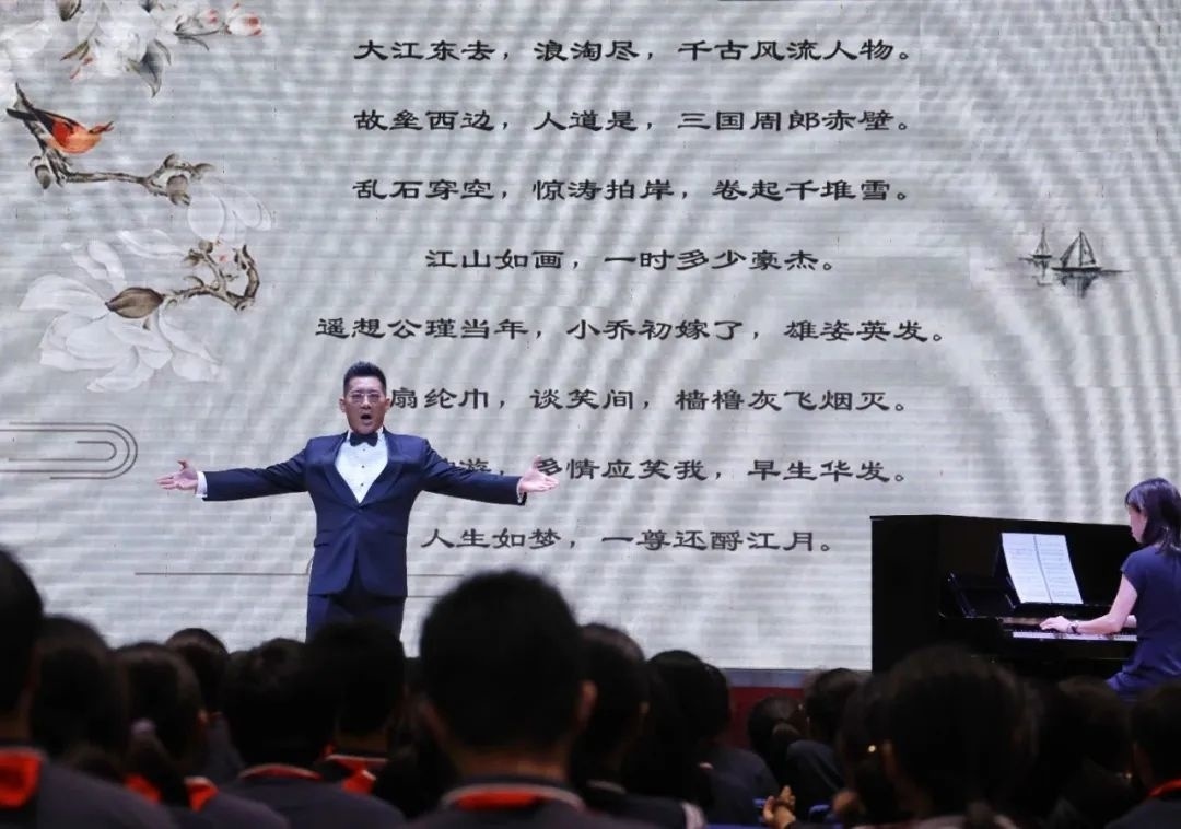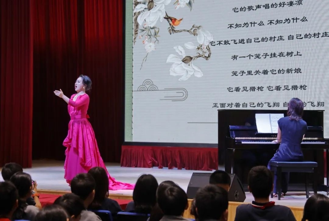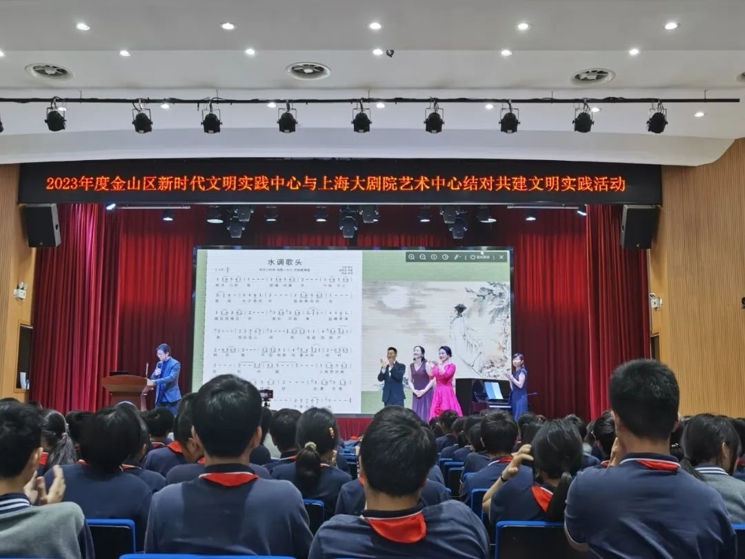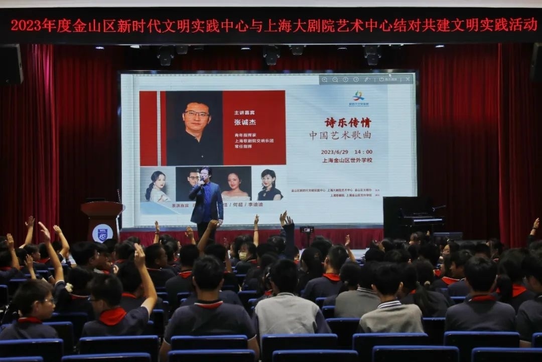 “东风夜放花千树。更吹落、星如雨。宝马雕车香满路。凤箫声动,玉壶光转,一夜鱼龙舞。蛾儿雪柳黄金缕。笑语盈盈暗香去……”在上海金山区世外学校小剧场里,不时传来阵阵美妙的歌声、乐声及观众的掌声与欢呼声。日前,艺韵湾区·高雅艺术进金山项目——2023年度金山区新时代文明实践中心与上海大剧院艺术中心结对共建活动进学校专场在上海金山区世外学校举行。