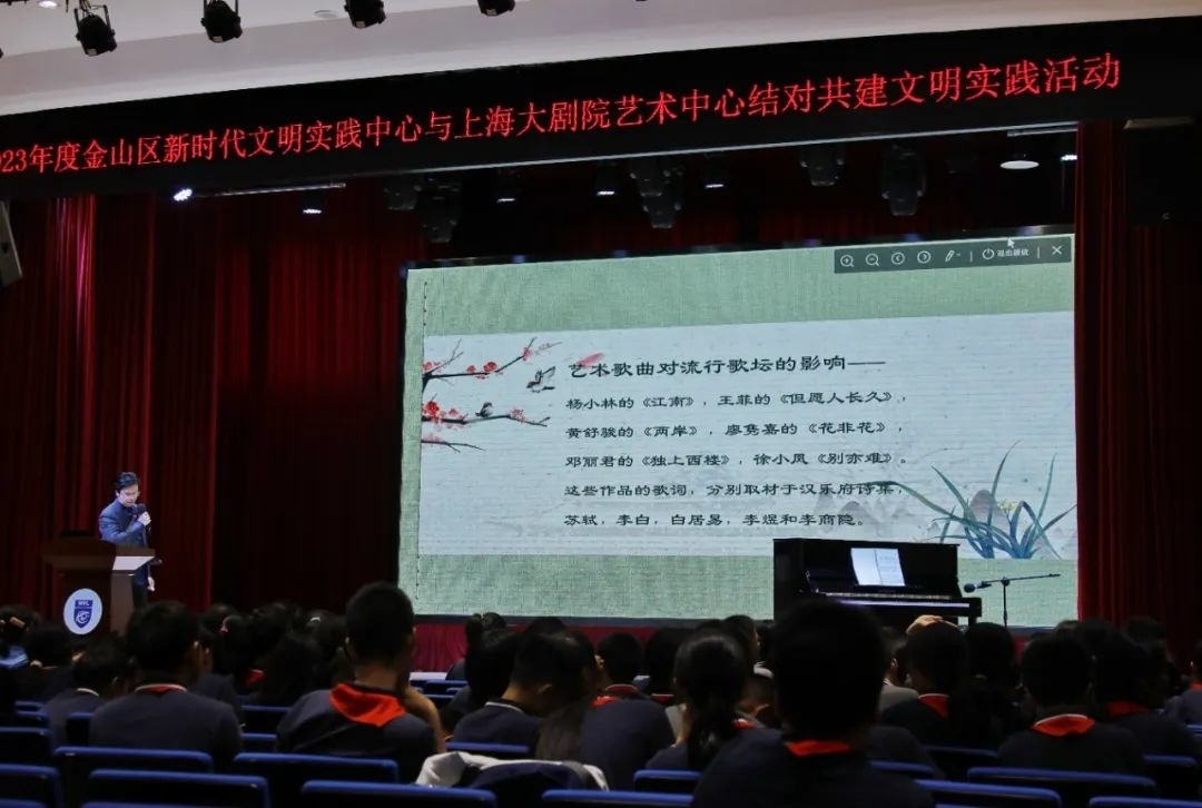 为提升金山区广大市民群众对艺术的理解与感悟,营造文明与文化同行的和谐氛围,2023年,金山区新时代文明实践中心与上海大剧院艺术中心条块联动开展艺韵湾区·高雅艺术进金山新时代文明实践项目,通过“艺课堂”让市民群众、专业志愿服务团队和星级志愿者有更多机会参与高雅艺术课程,亲身感受高雅艺术的魅力,也推动高雅艺术在金山的广泛深入和普及。