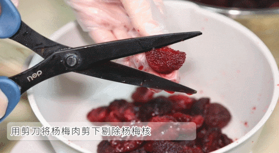 2. 用剪刀将洗净的杨梅肉剪下,剔除杨梅核。加入适量白糖腌制1小时左右。
