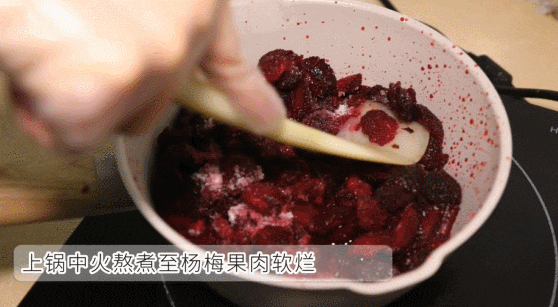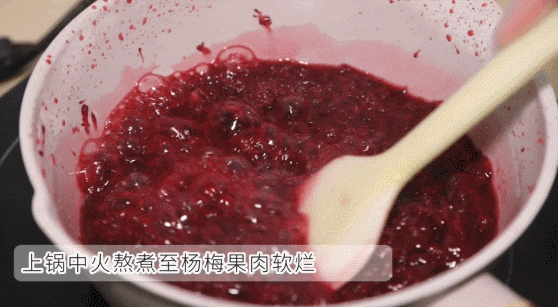 3. 将腌好的杨梅果肉放入锅中,用中火熬煮至杨梅果肉软烂。