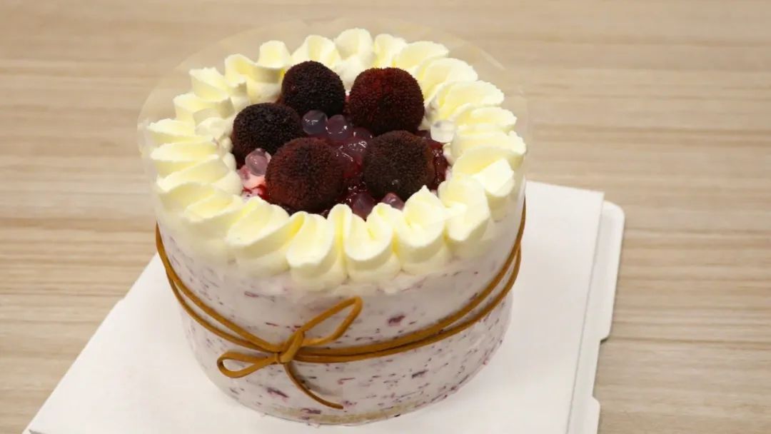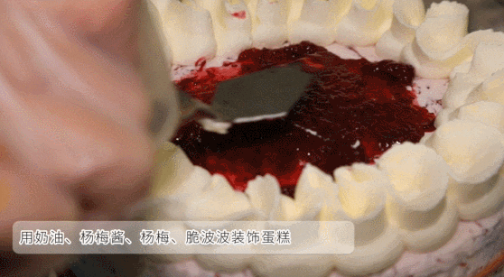 11.用奶油、杨梅酱、杨梅、脆啵啵装饰蛋糕。