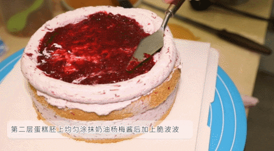 9.第二层蛋糕胚上均匀涂抹杨梅酱奶油,再加入脆啵啵后用奶油涂抹均匀。