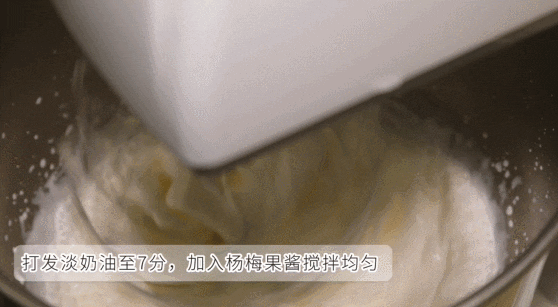 5. 将淡奶油打发至7分,再加入腌好的杨梅果酱搅拌均匀。