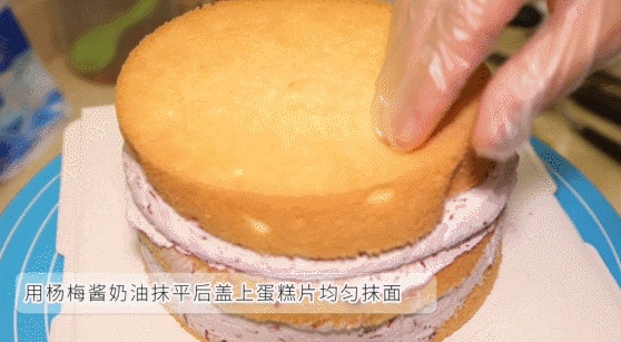10.盖上最后一块蛋糕胚,用杨梅酱奶油均匀涂抹整个蛋糕。