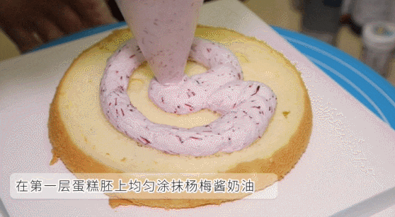 7.在第一层戚风蛋糕胚上均匀涂抹杨梅酱奶油。