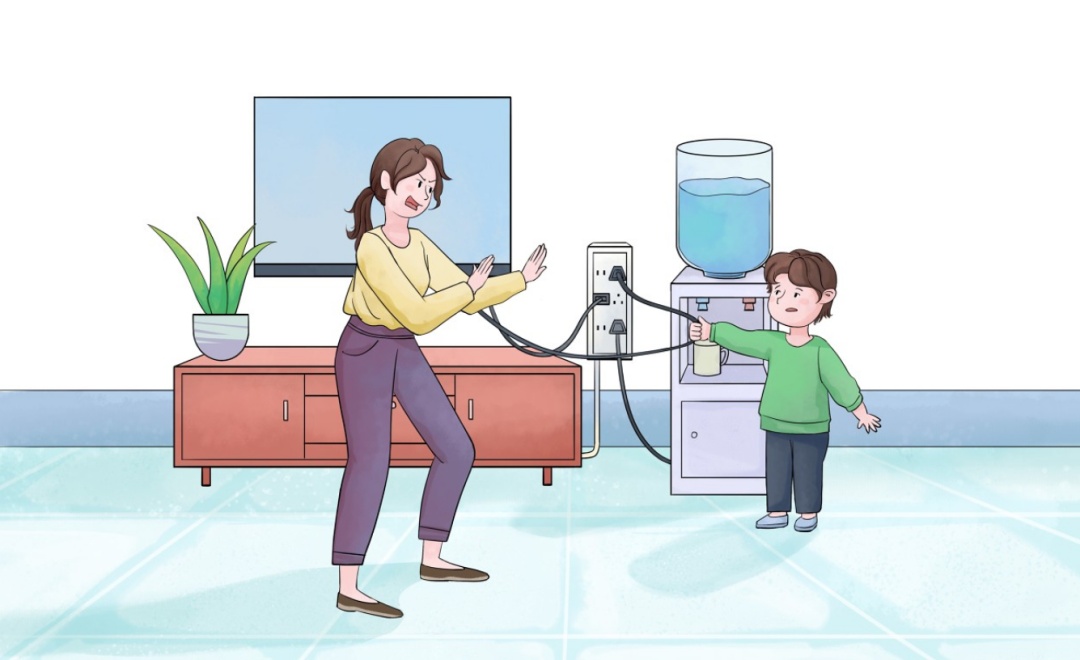 家中禁止在台布上放热容器、热菜、热汤等,以免儿童扯拉台布时,将热饭菜从头向下泼在身上导致烫伤。家长端热汤热水时,要大声告诉孩子“不要靠近”,防止小孩乱跑引起烫伤。