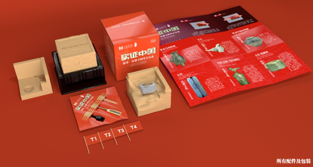 “藏礼于器”单元聚焦大众生活,试图在闲适日常中展现历史文物的美感与生命力。具有趣味性的考古盲盒将崧泽、良渚文化中典型的玉琮、玉璧、陶盉等文物藏入盒中,尘封的历史等待再一次显露,让我们在娱乐把玩之中亲身体验考古工作的惊喜与不易。