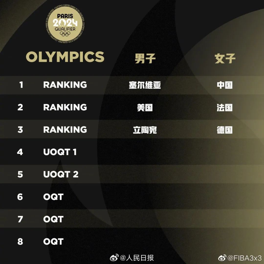 北京时间7月5日,据国际篮联官网,中国三人女篮积分超越法国,升至世界第一。根据规则,至今年11月1日,排名世界前三的队伍将直通巴黎奥运会正赛。