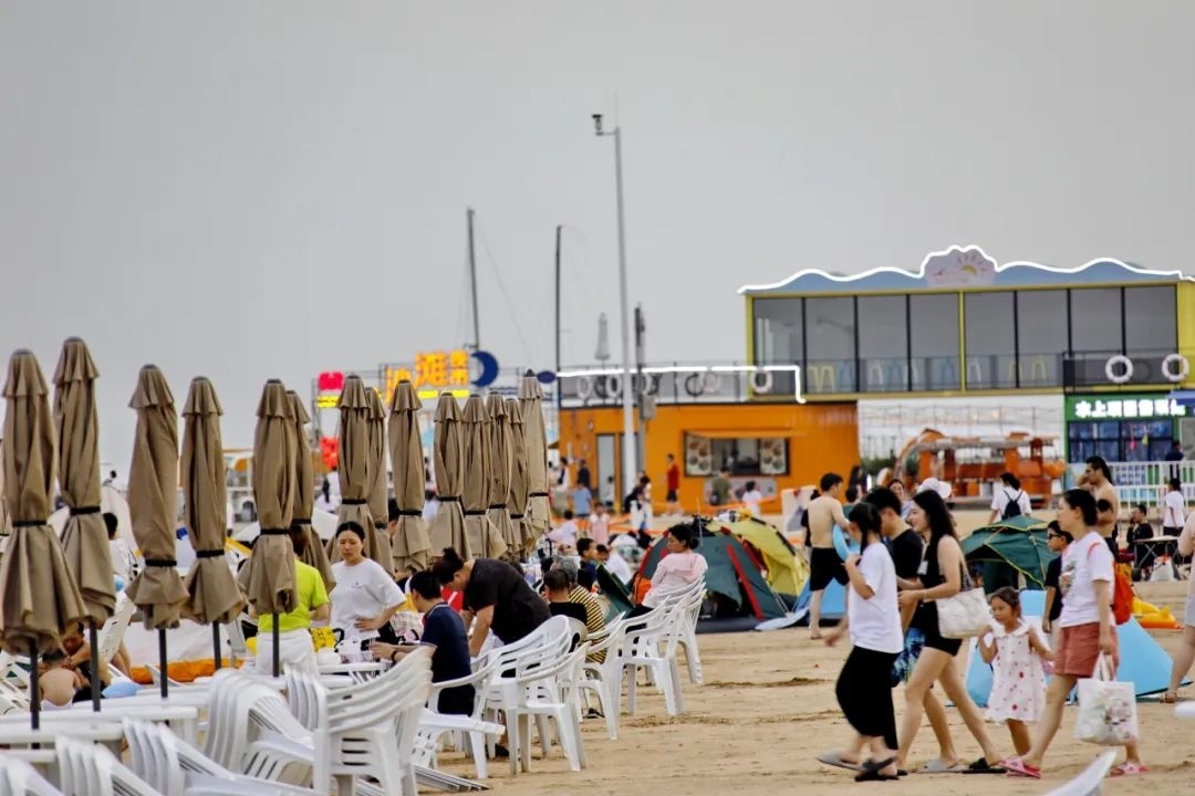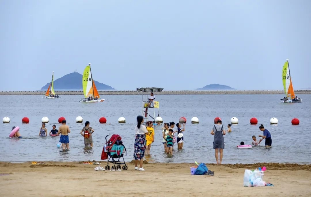 此外,正值盛夏,金山城市沙滩的泳区也已对外开放。游客们有的在沙滩挖沙子、搭帐篷,有的在海里嬉水游泳,还有的乘坐着帆船、摩托艇等水上游乐设施,体验不一样的海上激情。