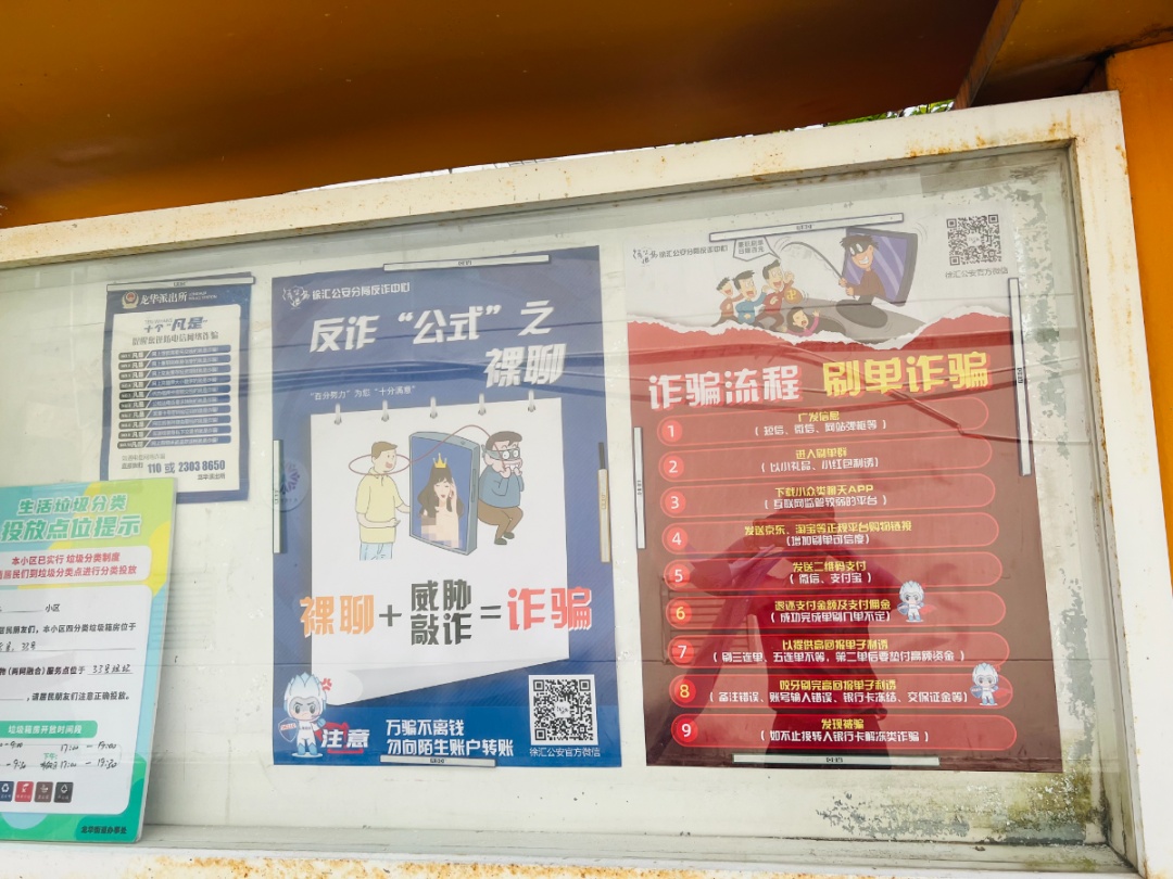 龙华街道平安办、社发办等部门,联合23个居委,在各小区宣传展板上张贴反诈海报。他们还利用小区门口的电子屏幕,滚动播放反诈标语,让居民在日常行走中就能接受到反诈教育。除了在公共场所进行宣传,社区工作人员还积极在居民微信群里发布警示案例、防范诈骗技巧;定期上门,面对面地向居民科普反诈知识。
