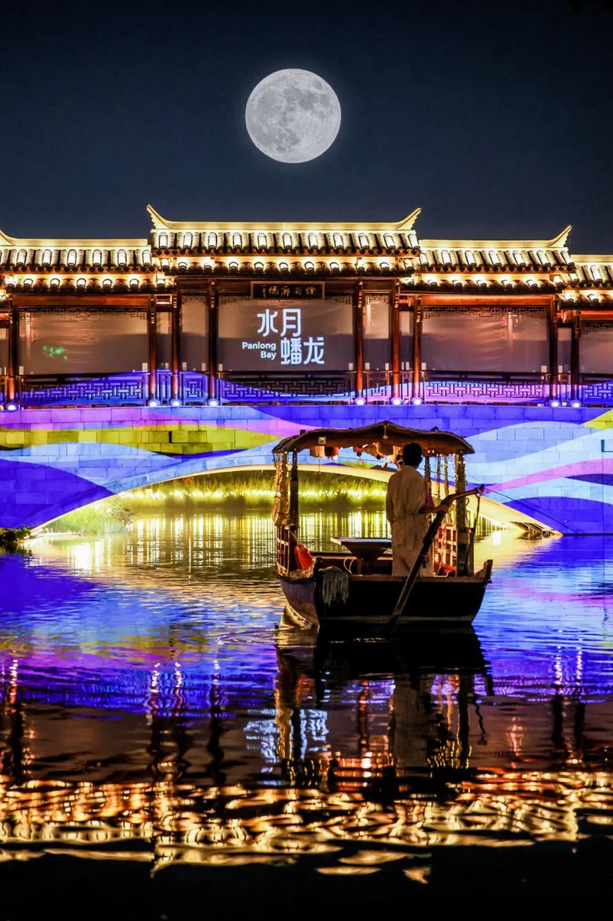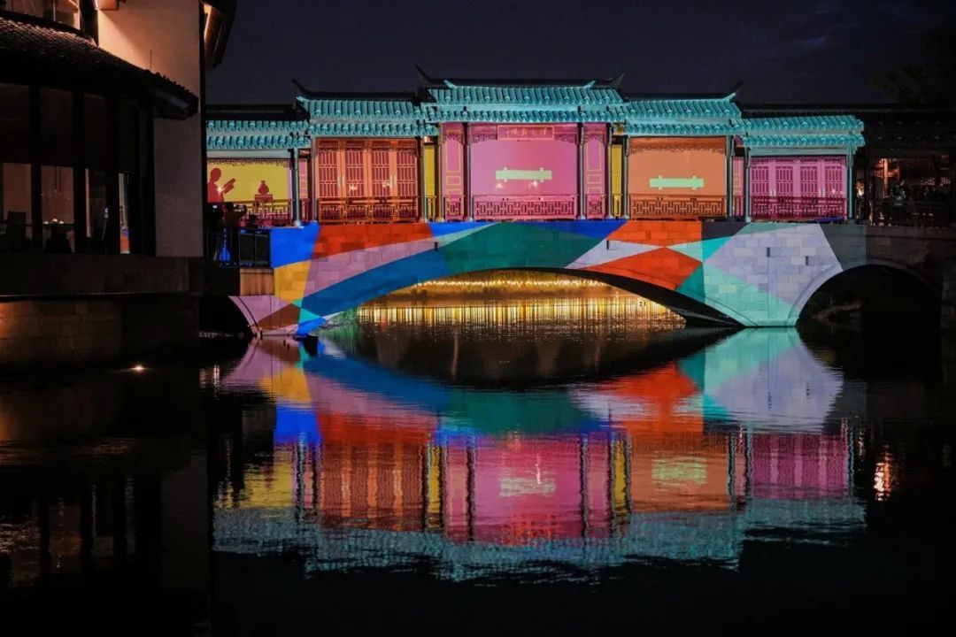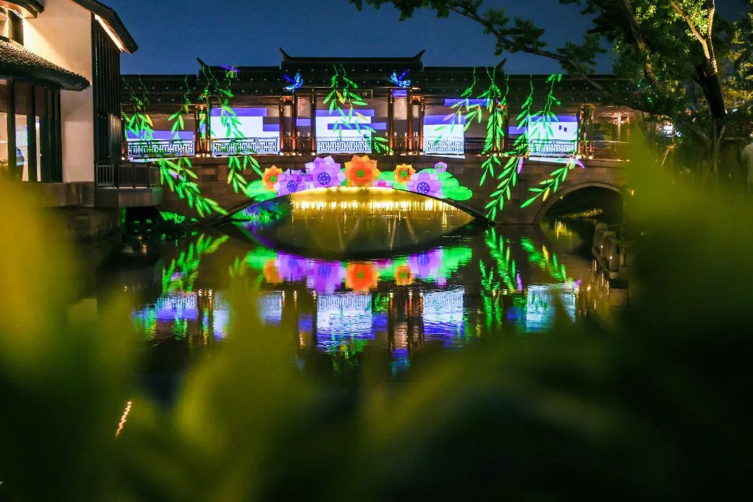 自蟠龙天地开业以来,“月见蟠龙”光影秀便每日在烟雨廊桥展出,竹林、树影、古镇的景色映照上古桥,夜色中的江南如梦如幻,亦古亦今,与蟠龙天地的江南文化相得益彰。时值夏日,为了带给市民游客更丰富新鲜的观影体验,光影秀夏日限定版悄悄上线,艺术家王智一在原本的“蟠龙新十景”中添加了独属于江南夏季的特色元素,呈现夏日的多巴胺色彩,成为蟠龙天地夜间的一道绝美风景线。