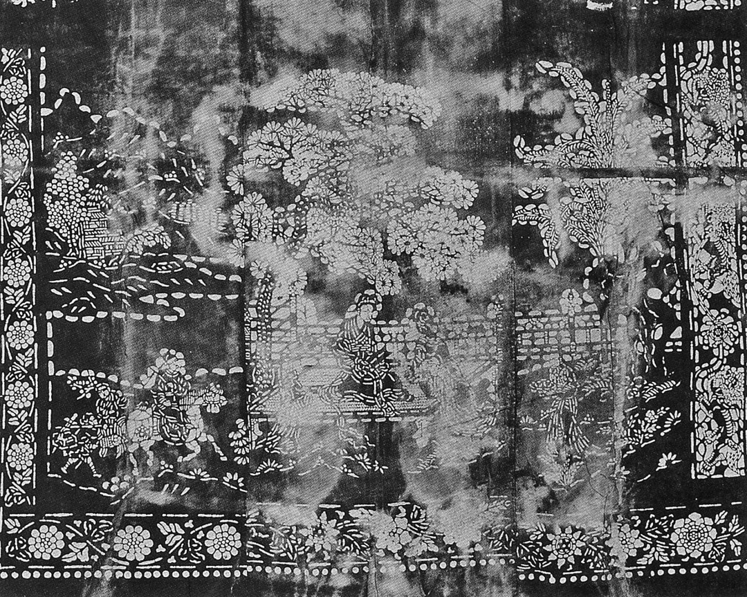 1965年在马桥镇三友村出土的明墓随葬品中,有四条蓝印花被,均长2米,宽1.7米,蓝色作底,上面印有繁复而活泼的白花纹,蓝白两色搭配自然和谐。《话说中国》丛书称:“这是目前上海乃至全国已发现的最早的蓝印花布实物。”据上海博物馆考古部介绍,其中第一条菱形方格纹被面,长1.94米,宽1.62米,三幅拼接,图案相同,每幅宽52厘米。在排列有序的连续菱形方格内饰花草、凤鸟、狮子滚绣球等花纹。被面从上到下带饰花纹为凤戏牡丹、菊花边饰,主体图案为连续菱形方格,正中心四格为一组,上下格内各印一只凤穿牡丹图,上格凤首朝下,尾上扬弯曲呈圆弧形,下格凤首朝上,双翅舒展,左右格内各印一只狮子,在花丛中滚绣球,左边狮子蹲踞,左瓜踩绣球上,右边狮子奔跑状,前爪刚扑到绣球,周围格内花卉纹质朴大方,充满浓郁的乡土气息。第二条被面有人物庭院图,长1.92米,宽1.27米,布幅宽42厘米。被面上下分别留有33厘米和31厘米的蓝色空间。四边框饰花鸟、狮子滚绣球图案。上部边框下一横排3个开光,内绘花鸟折枝纹。主体图案中部一棵参天松树,一棵高大的芭蕉树,之间庭院回廊,树下两个贵妇坐在回廊的榻椅上聊天,左边主妇发髻高盘,戴发簪、额带饰、耳坠等首饰,身着华丽服装,肩披霞帔,坐在榻上。右边贵妇坐榻沿,两人在闲聊。左侧立一侍从,似在向主妇禀报,右侧一侍从双手端盘朝主妇走来。画面左侧为山峦、树木、亭阁庙宇,崎岖小路从山上弯曲而下。一匹昂首奔马四肢矫健,马上是头戴乌纱帽的官人,策马扬鞭,身后跟着两个挑行李侍童,正沿着山道匆匆而来。整个画面有这3幅图案组成,表达了一个故事。