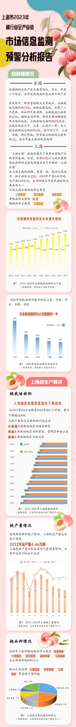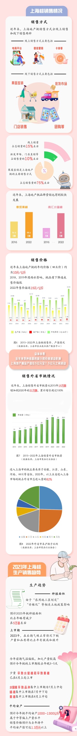 你知道近年来地产桃子的生产情况吗?销售方式有哪些?……市农业农村委介绍,上海市农产品(瓜果)全产业链市场信息监测预警分析团队日前公布了《上海市2023年桃行业全产业链市场信息监测预警分析报告》,一起来看吧↓