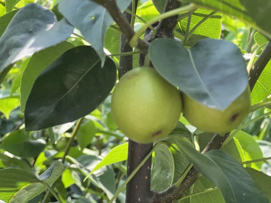 长堰村的翠冠梨园内,一片片的梨树在阳光下显得格外郁郁葱葱。梨树上结满了一个个饱满的果实,看着让人直咽口水……