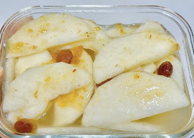 吃法二:去皮切薄片,加入酸梅汁,冰箱冷藏后酸酸甜甜,美味可口。