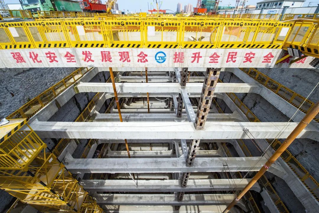 在围护结构施工阶段,不同于过去“地下连续墙加内支撑”的体系,借鉴基坑工程中液压钢支撑与建筑工程中整体滑模的技术理念,将两种技术相互结合,形成一种整体滑降式预支撑系统,由钢框架支撑模块、千斤顶液压系统模块、竖向滑降模块及监测控制模块四大模块组成,通过该系统可实现主动支护,每层支撑(钢筋混凝土)从开始施工到形成支撑作用期间,地墙变形从常规5至10毫米减小为3至5毫米,在有效提升施工效率和质量的同时,确保了施工安全,保障项目有序推进。