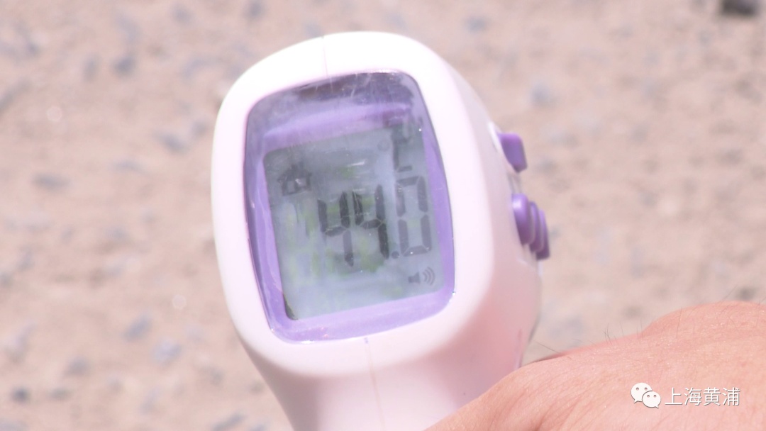 今天上午9点45分左右,记者在南浦大桥浦西上匝道前,用温度计测得地表温度已达到44摄氏度,而在南浦大桥浦西向浦东方向两圈半的黄浦交警二大队执勤点,地表温度达到了48.5摄氏度,足足比地面温度高出了4摄氏度。