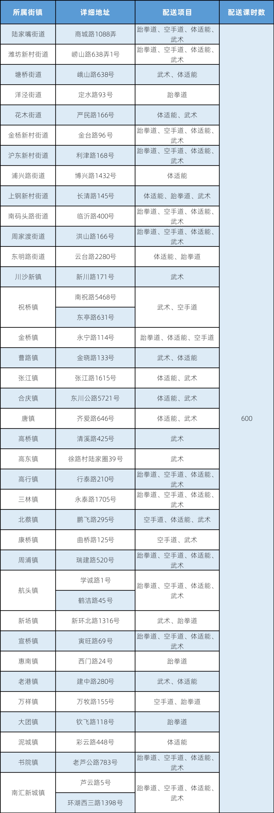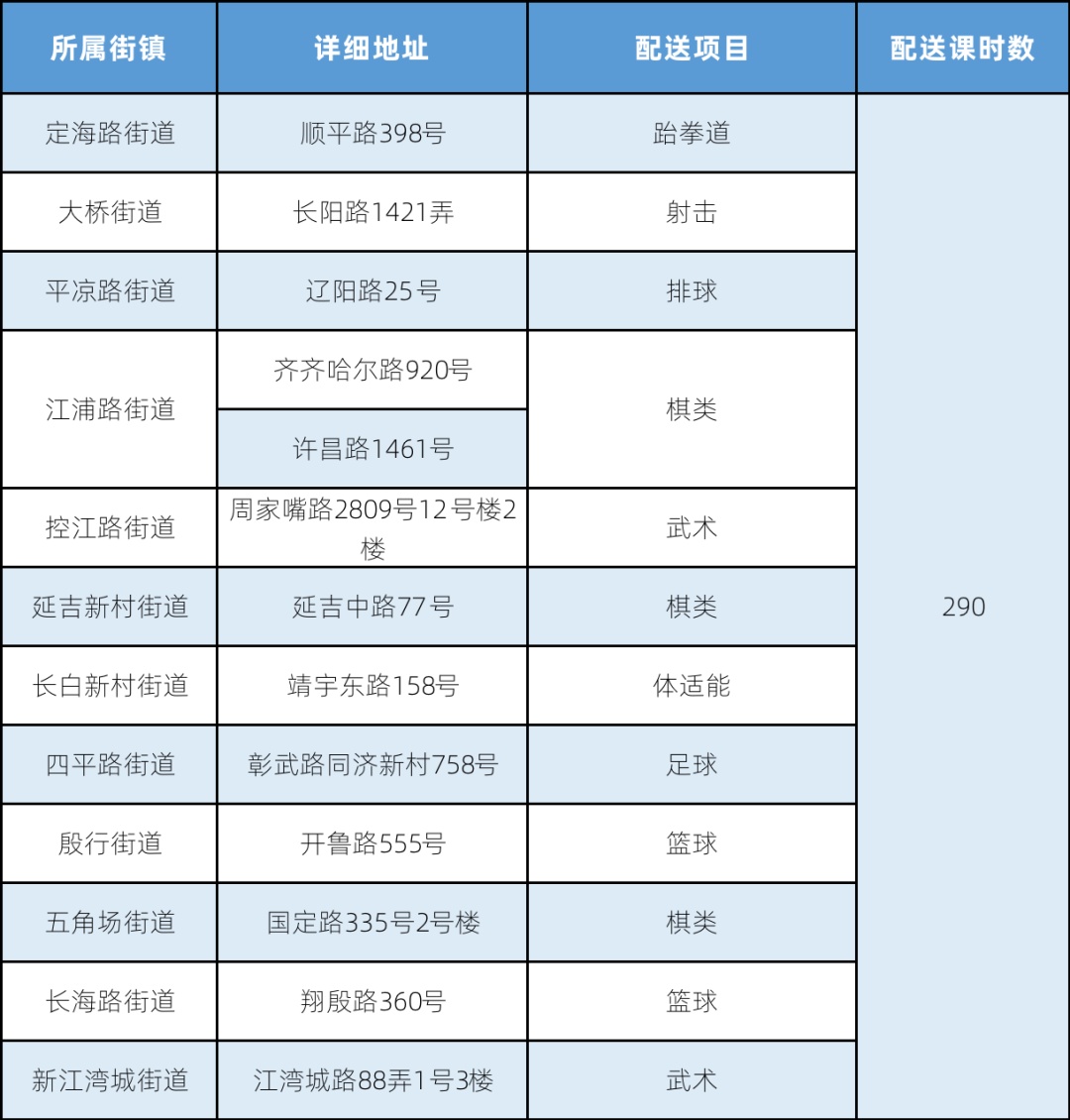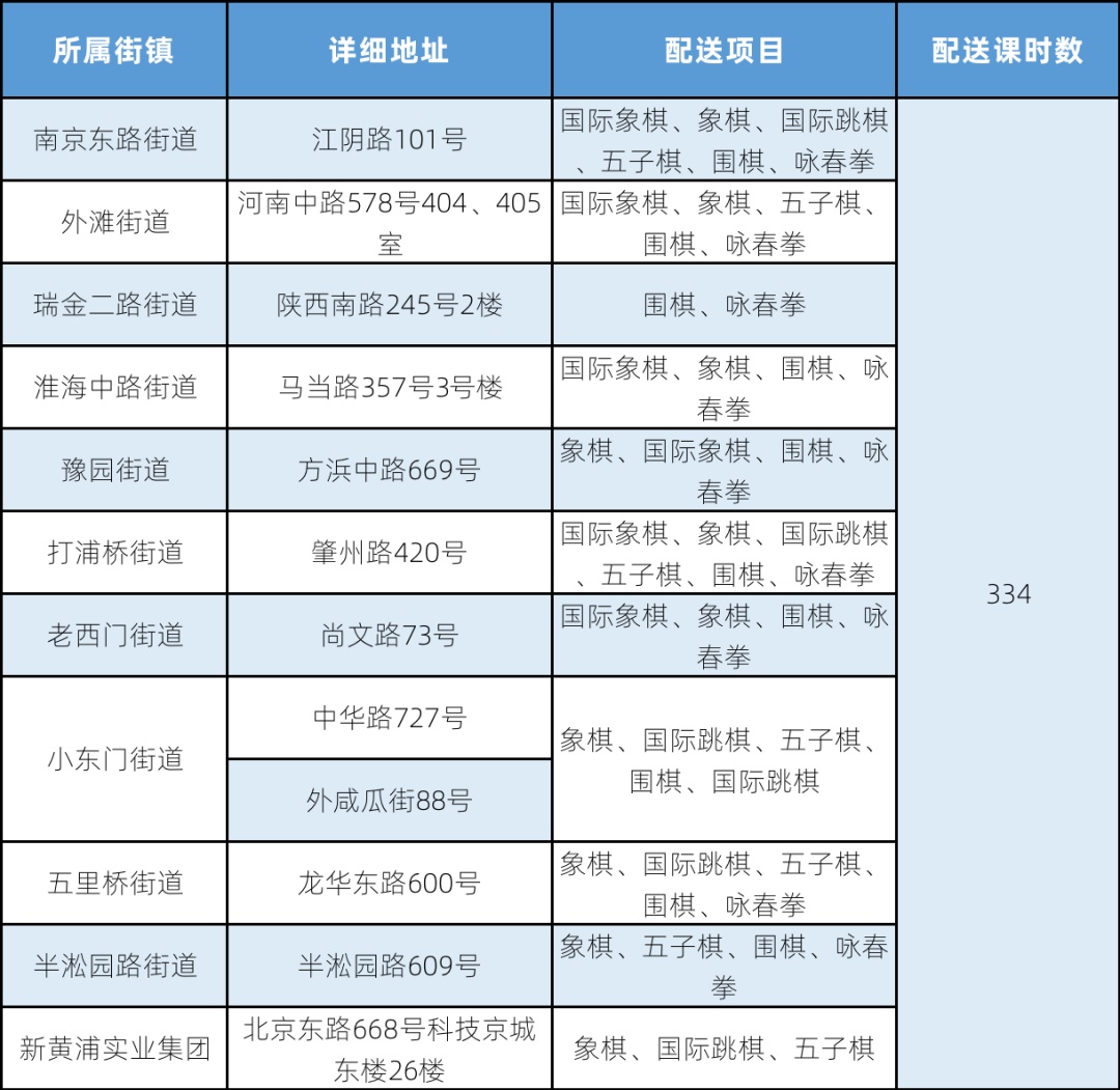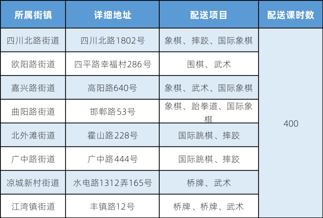 注:表格中所列为该办班点举办体育项目培训的汇总情况,因场地、天气、参加时间、班级等情况的不同,与实际开设的项目可能有差异。