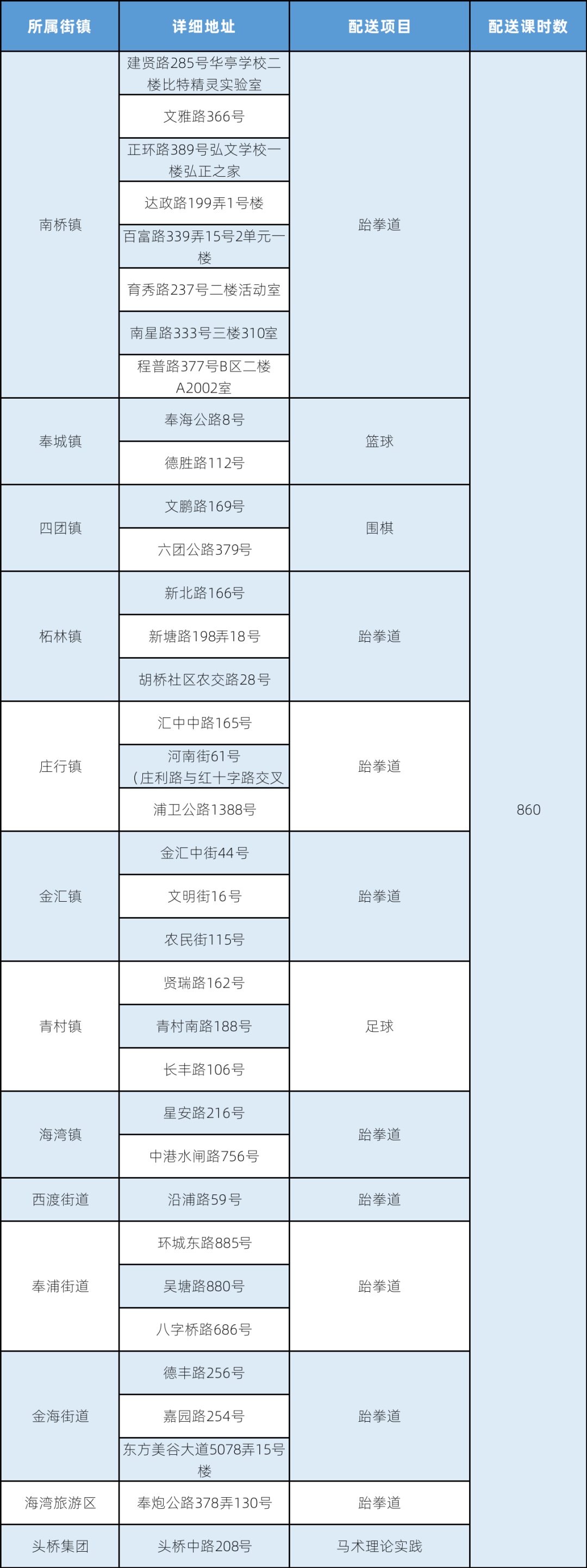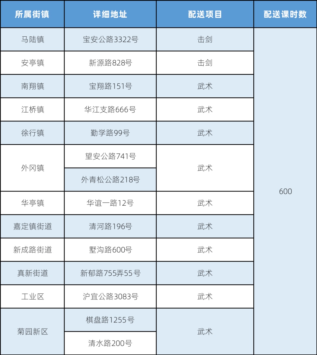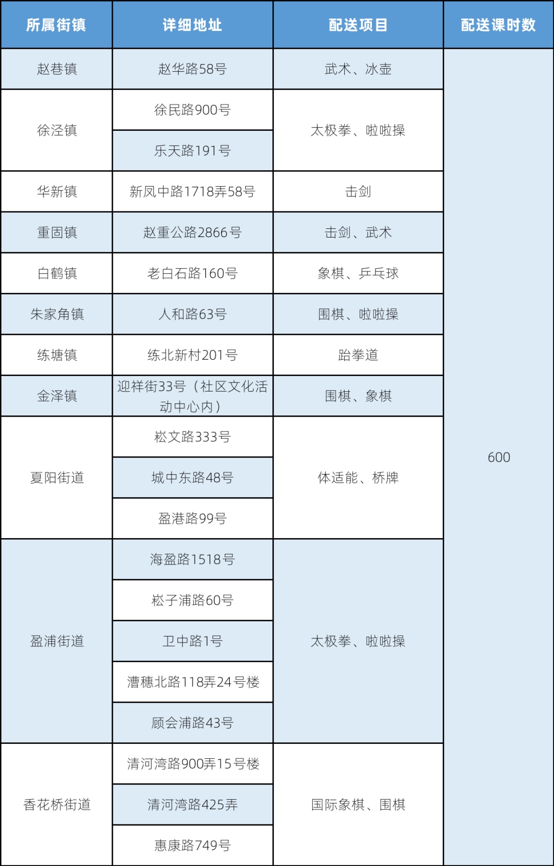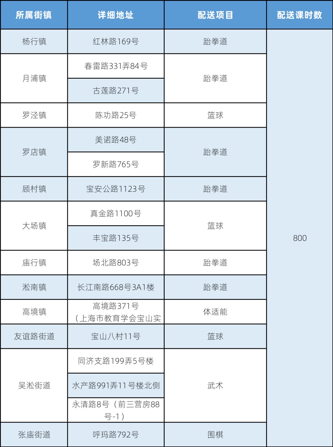 注:表格中所列为该办班点举办体育项目培训的汇总情况,因场地、天气、参加时间、班级等情况的不同,与实际开设的项目可能有差异。
