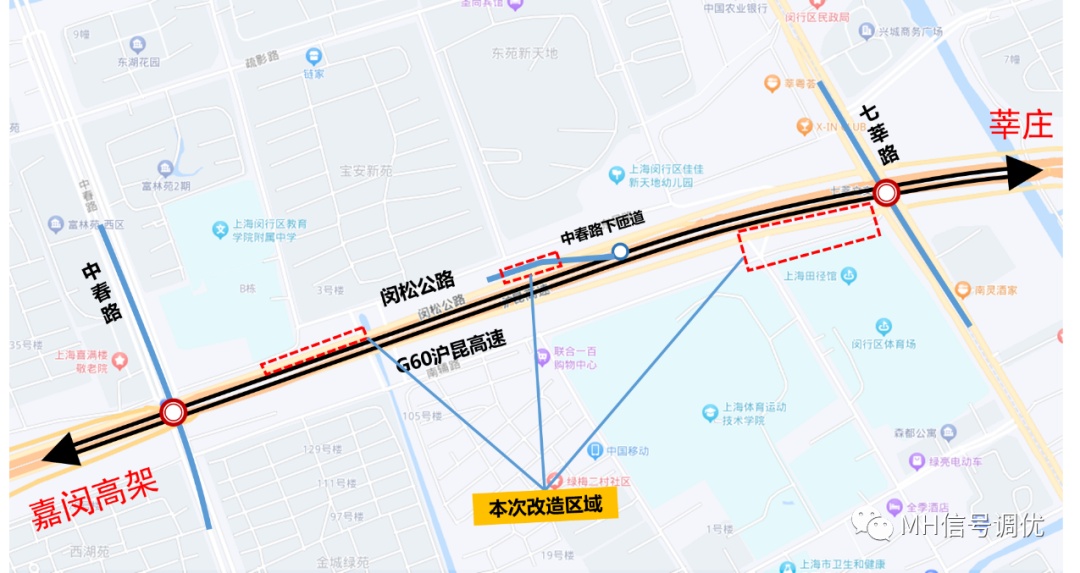 闵松公路为东西向连接闵行区与松江区的重要交通主干道,道路上方为G60沪昆高速,闵松公路(七莘路-中春路)区段间距1公里,布设有G60中春路下匝道。早晚高峰大量机动车在此区段聚集和分散,随着交通需求的不断增加,原有交通组织方案已不能匹配当下的交通流特性,路段出现交通拥堵、匝道溢流、排队较长等问题,不仅会影响高架主线的交通运行,也造成日常通勤者出行体验不佳。