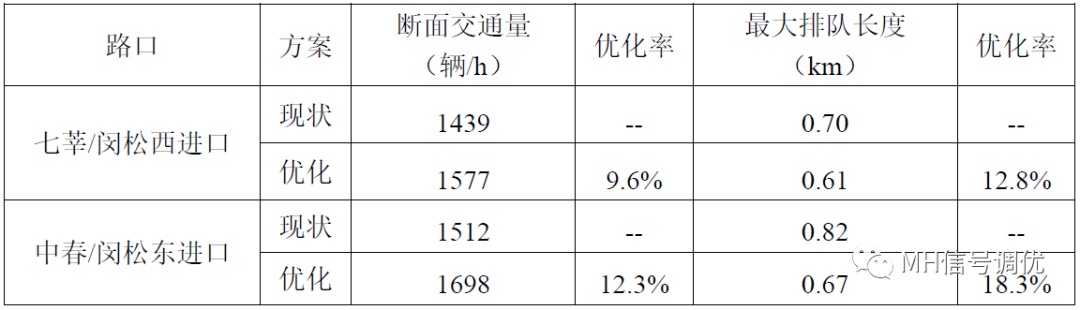 1.高峰期间,七莘/闵松西进口单位小时的通过车辆数由1439辆/h提升到1577辆/h,通行车辆数提高9.6%;中春/闵松东进口通过车辆数提高12.3%;