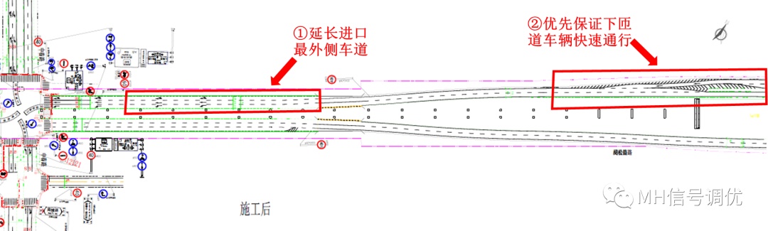 ②地面与下匝道合流处,利用标线重新分配路权,下匝道由一根道变为两根道,加速匝道车流疏散。
