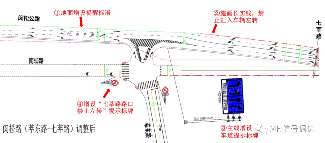 通过标志、标线的设置,禁止南辅路、莘东路方向来车多次变道左转,以此降低变道车辆对于主线车流的影响,保障主线车流通畅运行。