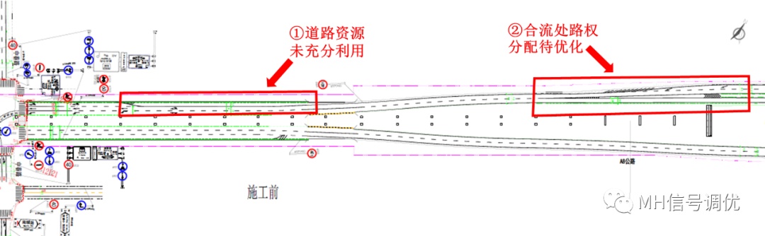 ②下匝道与地面道路合流处,地面交通流量较小,而高峰时段下匝道排队已溢出至主线,现状地面道路与下匝道各占一根道,不利于快速疏散车流。
