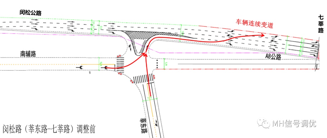 路口为闵松公路/南辅路/莘东路三条道路构成的不规则路口,路口运行较为复杂。经观察发现,南辅路、莘东路方向来车,在七莘/闵松西进口左转需经多次连续变道才可通过,而变道距离过短且主线车流量大,连续变道对主线车流产生较大影响,不仅影响路口通行效率且易发生交通事故。